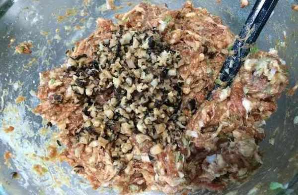 第7步,然後把香菇和筍碎都放入肉餡中,加入適量的油,生抽,蠔油,鹽,攪拌均勻。
