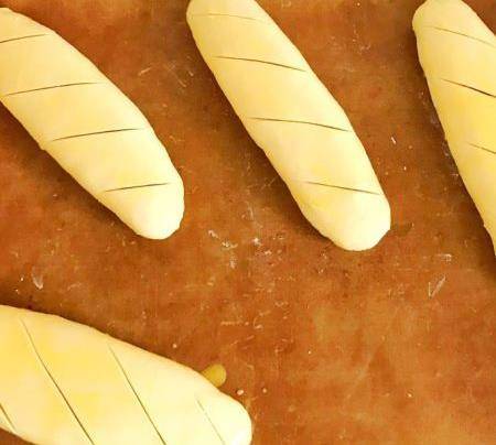 步驟重復做好兩外2個,表面刷雞蛋液,用鋒利刀片切割幾下,便於烤制過程中散發熱氣