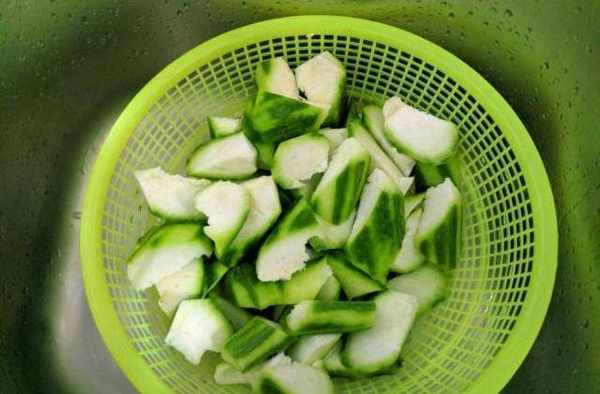 1.準備絲瓜,把絲瓜滾刀切成每一塊,然後裝在一起