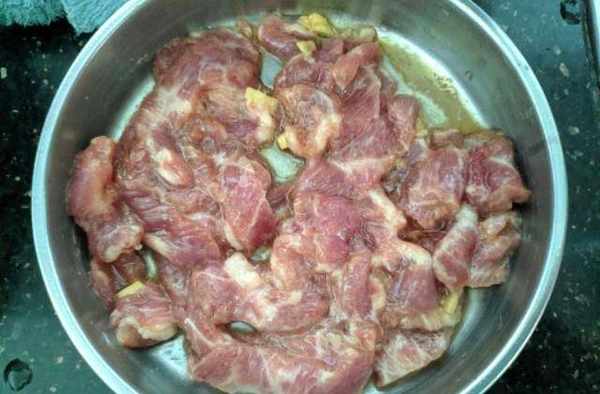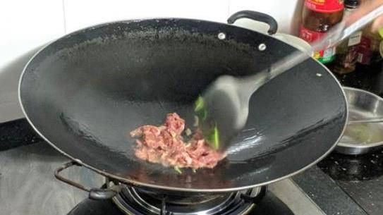 10.和邊上的肉片一起翻炒一會,然後蓋上鍋蓋等待1分鐘