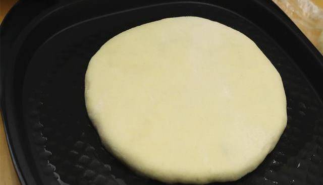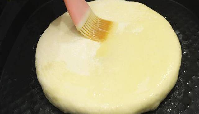 13.電餅鐺預熱後,倒入適量的油,放入餅坯。
