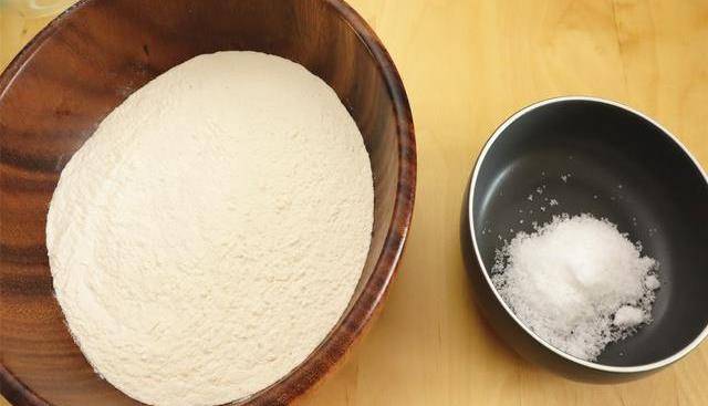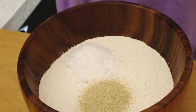 2.準備500克面粉,放入5克酵母,再倒入15克白糖促進發酵,攪拌均勻。