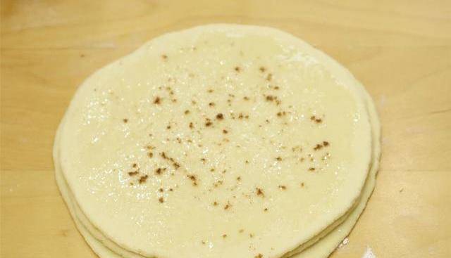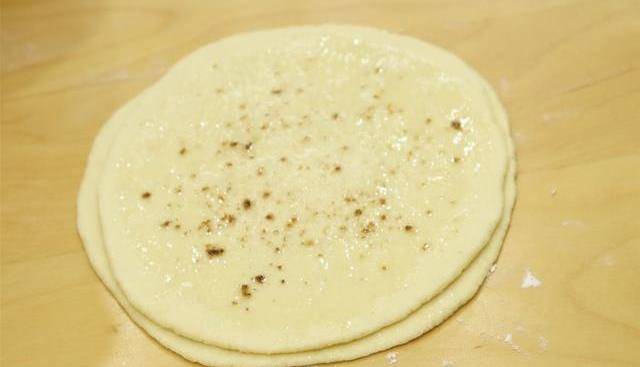 10.相同的方法在搟一張偏小一點的餅,放在第一張餅上,同樣刷油,撒花椒粉和鹽。