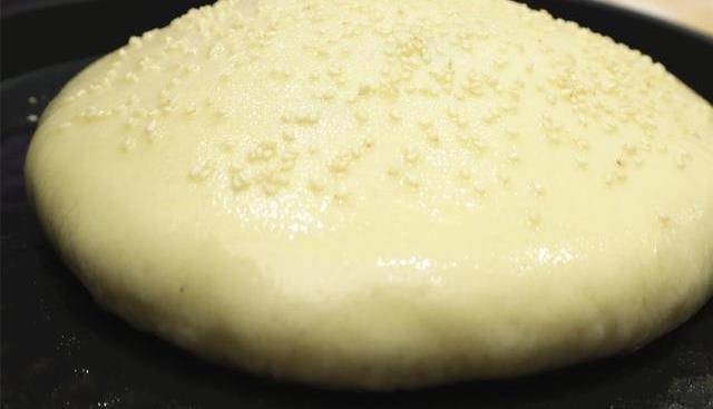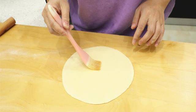 14.在餅上刷上一層油,撒上適量的白芝麻。