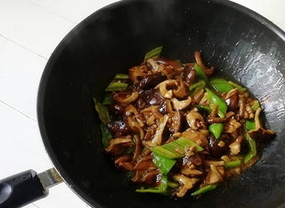 6.下入香菇翻炒均勻,加入鹽,少許白糖,少量水,燒開