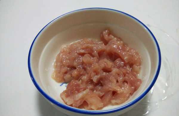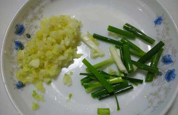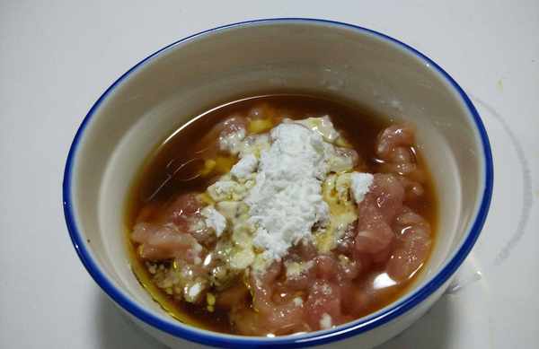 2、肉絲加入蔥段和適量的生抽、料酒、油和淀粉,然後抓一下,拌均,放一邊待用。這樣做的目的主要是讓肉絲更加的嫩,不會老,口感好。