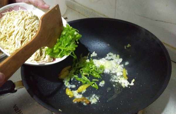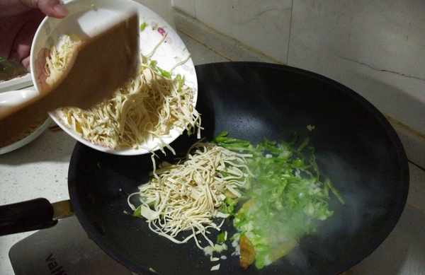 6、泡椒和蒜泥薑末煸炒後,放入青椒絲煸炒,燒幹水份,然後放入千張絲煸炒。