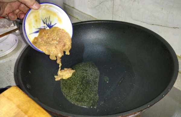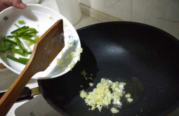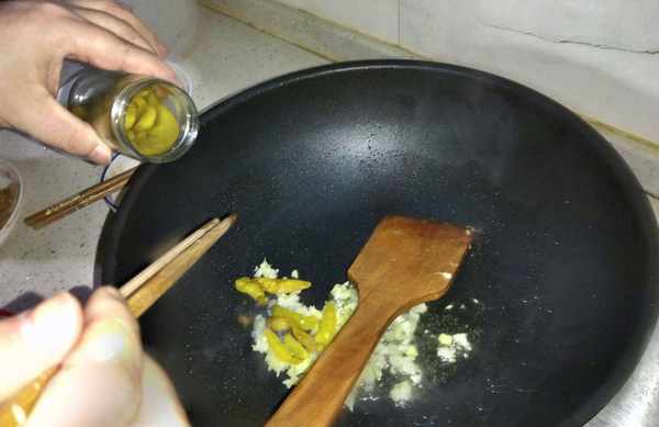 5、鍋內放入適量的油,燒熱,下泡椒和蒜泥薑末煸炒,炒出香味兒。