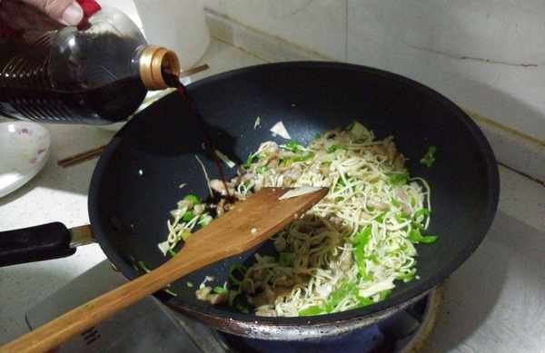 鍋裡到油,最好是用不粘鍋,油不能多也不能太少,不然肉絲炒不散就不好吃瞭。待油溫稍微高一點左手一邊倒入醃制好的肉絲,右手一邊用鍋鏟快熟攪動使肉絲快速分散,呈現分散的一根根的裝態。這樣做的好處是,肉絲不會都黏在一起成為肉疙瘩,一大坨,更容易分散在青椒絲中,吃起來清爽,看起來好看。