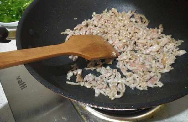 3、鍋內放入適量的油,燒熱,將醃好的肉絲放入,快速滑炒至七成熟,盛出待用