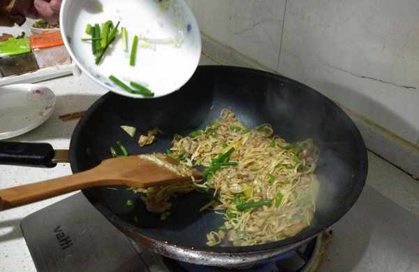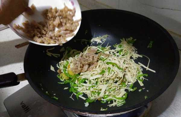 7、,青椒千張煸炒好後,放入剛剛待用的肉絲,翻炒後加入生抽、鹽和一點點白沙糖,翻炒均勻,最好放入蔥段翻炒幾下即可出鍋。