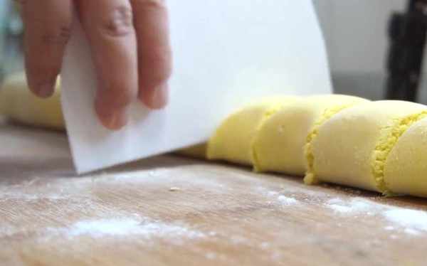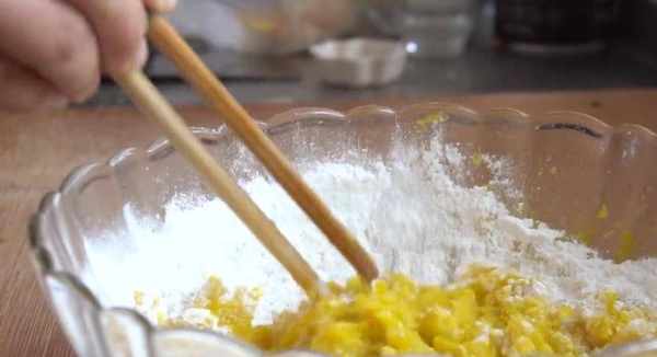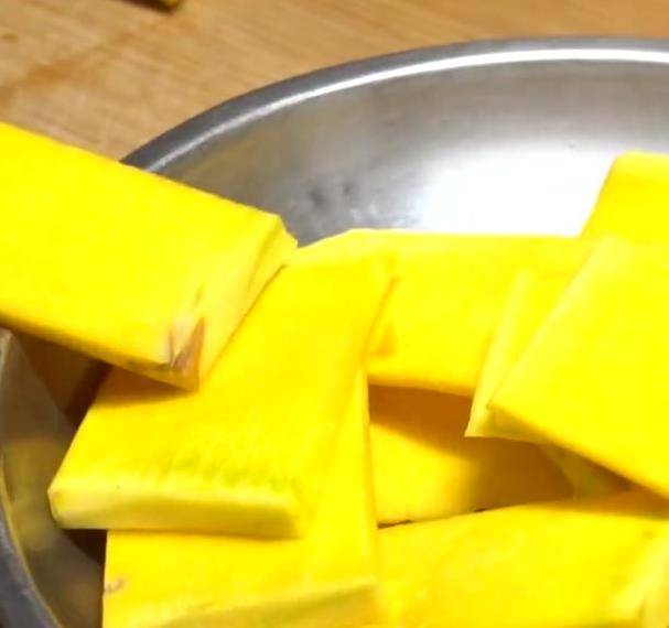 今天給大傢分享一道南瓜的新吃法,表皮酥脆,內裡柔軟,有一口滿嘴的香甜。下面我們開始制作。南瓜切薄片放入容器中,鍋內上汽後蒸15分鐘。蒸好的南瓜,去掉多餘的水分,放到一個大的容器內,趁熱倒入25克的白糖,早晨細膩一點的南瓜泥。這時候我們少量多次地加入糯米粉,糯米粉的多少要根據南瓜的含水量添加。我一共是放瞭300克的糯米粉。攪拌成這種狀態的時候,下手揉成一個光滑的面團,滾成長條形。