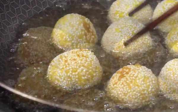 大小均勻的面積,取一個面劑,這樣反復揉搓。這樣做的目的就是讓面團變得細膩、光滑又軟弱。揉成一個小圓球的形狀。首先沾少許清水,稍微滾一下。準備適量白芝麻,帶水的面團會把白芝麻粘得更緊,粘好白芝麻之後掌心再繼續揉搓,讓白芝麻更牢固一些。這樣一個南瓜球的生胚就做好瞭。鍋內、油溫到5成熱的時候,開始把南瓜球下鍋炸。等炸至金黃的時候,用勺子反復按壓,可以讓表皮更酥脆、熟得快,這樣南瓜球就做好瞭。