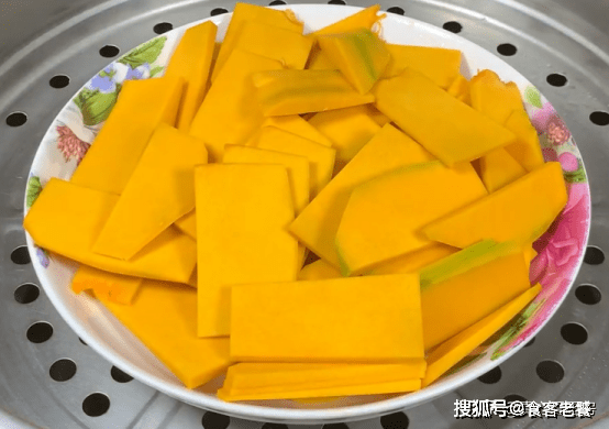蒸熟南瓜後,裝入盤中整理整齊,放到蒸屜裡,蓋上蓋子,大火燒開,計時蒸15分鐘,直到南瓜蒸熟。