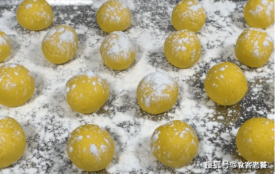 將南瓜泥與糯米粉混合,揉成一個軟硬適中的面團,並分別捏成小圓球。將丸子擺放在帶有幹糯米粉的托盤中,裝入保鮮袋或者盒中冷凍備用。