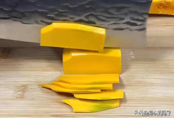 準備一個南瓜,將其對半切開並去皮,用清水清洗幹凈,然後控水撈出。將南瓜切成厚片,再改刀切成薄片,盡量切得越薄越好。