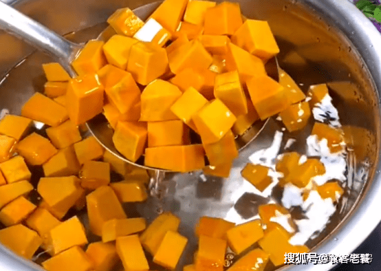 準備一個南瓜,去皮切成小方塊,用清水洗掉淀粉,控水備用。