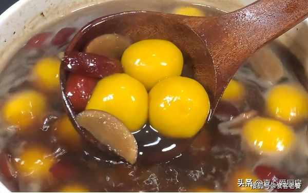 在湯鍋中加適量清水和兩塊老紅糖,放入切好的紅棗片並大火煮開。轉小火煮五分鐘,加入糯米南瓜丸子,期間輕輕推動防止粘鍋底,加入一勺冷水降溫後再次煮開。