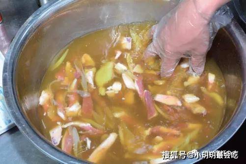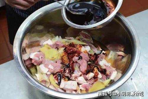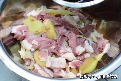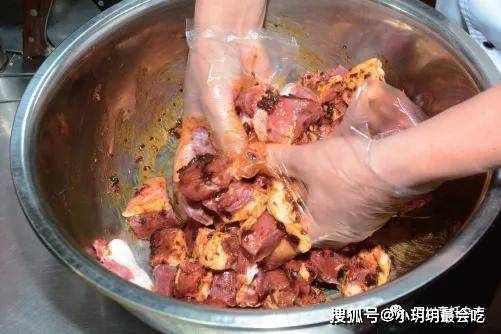 4.醃漬主料。往盆中的羊肉塊上舀入適量事先制好的醃漬料,用手抓拌均勻後,靜置醃漬1個小時左右,以使羊腿肉充分入味(見圖5、圖6)。