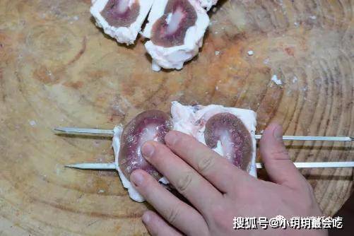 2.把修整好的灘羊腰子逐一從腰子正中間切開,盡量切到兩邊一樣大(見圖2)。3.接著用兩根不銹鋼簽把對剖開的灘羊腰子穿起來,如此依次穿好四個(見圖3)。