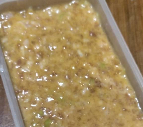 第2步、把三個蛋的蛋清和50克肉碎、適量蔥白、鹽、少許面粉、0.1克小蘇打攪勻,倒入刷過油的模具裡,入鍋蒸10分鐘。