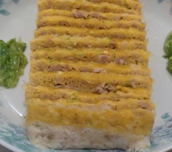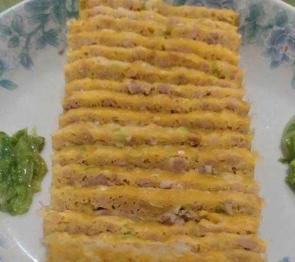第3步、然把三個蛋黃、50克肉碎、蝦米、鹽、面粉、蔥白、小蘇打拌勻,倒入剛蒸過的蛋清肉餅上面抹平,入鍋中火蒸10分鐘。.