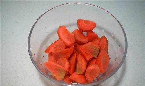 第二步:把胡蘿卜撈出來,如果有泥,把泥洗幹凈,然後用刮刀刮掉外皮,再把胡蘿卜洗幹凈。然後將胡蘿卜切成菜塊,放入碗中待用。大蒜洗凈切片,薑洗凈去泥切片,大蒜切碎。