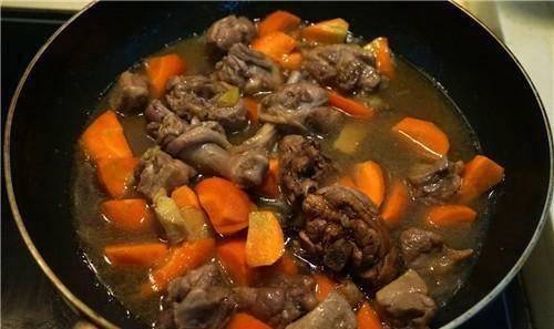 第三步:取出平底鍋倒入油,加入冰糖、蔥、薑、蒜、八角開始小火炒。烤到有香料味後,放入鴨片,中小火同時煎,烤一會。倒入一罐啤酒,蓋上蓋子,小火。.然後我們開始慢燉,大約燉1小時後,加入胡蘿卜,加入醬油和鹽,拌勻,燉10分鐘即可食用。