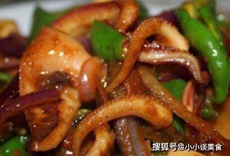 3.將油倒入鍋中。油熱後下蔥、蔥、蒜、豆瓣醬爆香,下入魷魚翻炒,再加入雞粉、胡椒粉、鹽、料酒調味,最後加入綠色和紅色的辣椒。攪拌均勻,然後從鍋中取出。