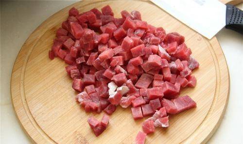 1.先將牛裡脊切成方塊,加入薑、醬油、糖、黑胡椒。用手拌勻後,我們放入冰箱醃制20分鐘。將大蒜切成細塊。我們將青椒和紅椒切成小方塊。
