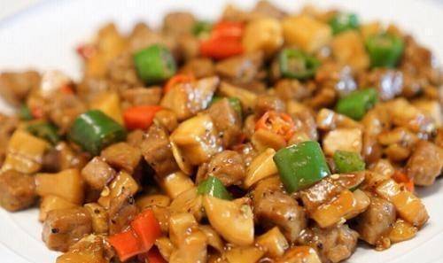 4、再起鍋燒熱油,小火將牛肉丁炒香,然後將平菇回鍋,兩面煎熟,然後加入醬汁入鍋調味,最後加入。青椒和紅椒炒熟即可。