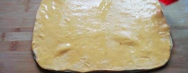 大約200克左右的面粉攪拌成面絮皂,在軸承偏硬一點的面團,蜜蜂醒發質量不大,接下來準備200克面粉,兩克酵母溫水110克,先把酵母化開在邊倒邊攪拌,攪拌成面絮狀,再揉成光滑偏硬的面團,蓋上保鮮膜醒發質量倍大,兩種面團全部醒發好後先把白色的面團進行揉搓排氣,盡量排幹凈空氣,再啃成厚度約4毫米左右的長方形面皮,用同樣的方法把黃色的面團也進行揉搓排氣,最後搟成和白色面皮一樣大的長方形面皮即可。接下來我們在白色面皮上刷一層食用油刷均勻,