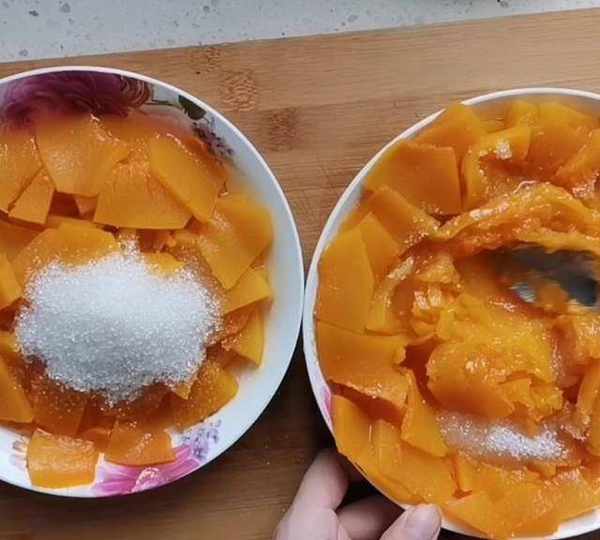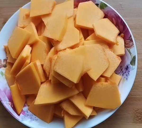 第1步、把南瓜去皮,洗幹凈後切成薄片。上鍋蒸十五分鐘。