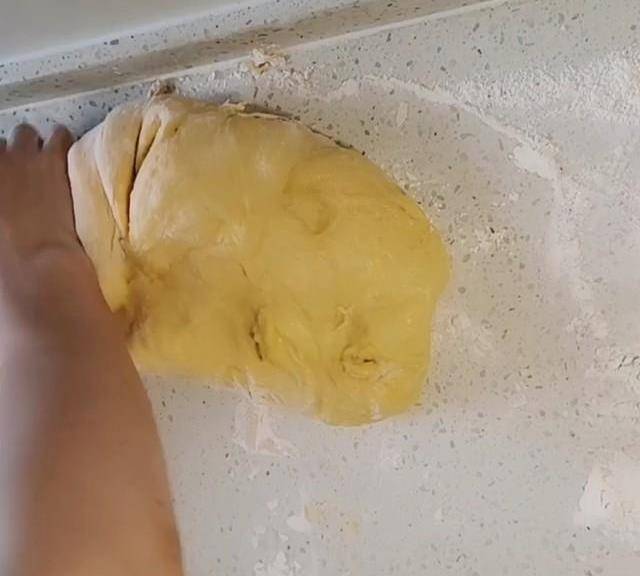 第5步、面板上撒上幹面粉。把發酵好的面團拿出來排氣。