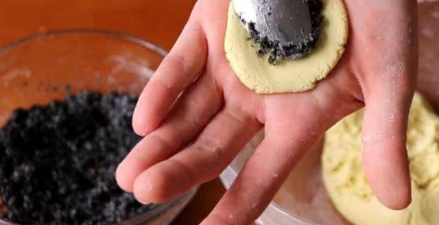 6.取適量南瓜面團揉成團,再壓扁放入適量芝麻碎,用虎口收攏粘合緊,再稍微整理一下成丸子,將剩下的南瓜面團全部做好。