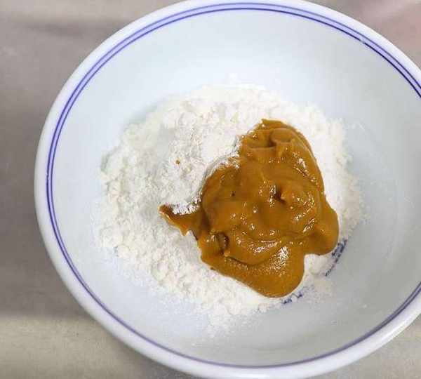 第5步、南瓜泥倒入面粉中;面粉的吸水率不同,南瓜泥的稀稠度也不同,所以南瓜泥可先按面粉量的65%的放,看狀態再逐量添加;150克面粉我放瞭100克純南瓜泥。