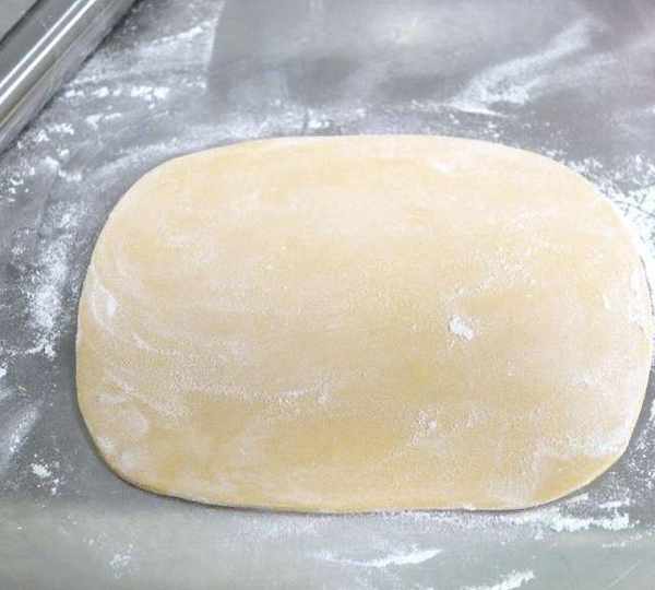 第9步、案板上撒適量面粉(份量外),將餳好的面團放在案板上,搟成厚約5毫米的面片。