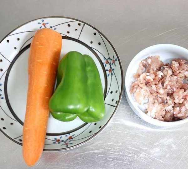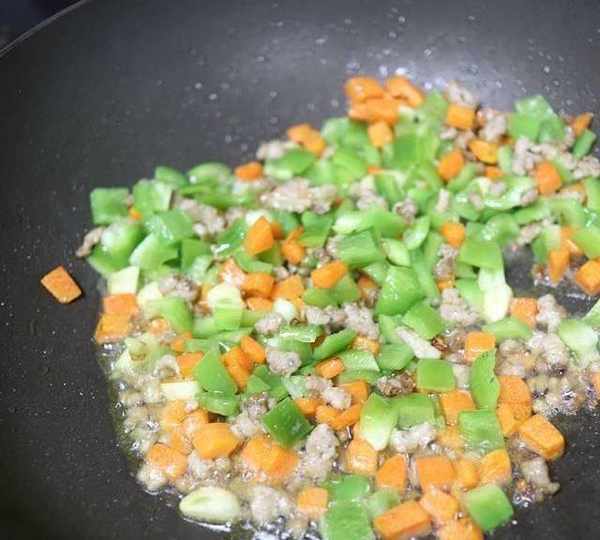 第15步、簡單做個澆頭:肉餡、胡蘿卜、青椒,不限於這些材料,可根據個人口味進行調整。