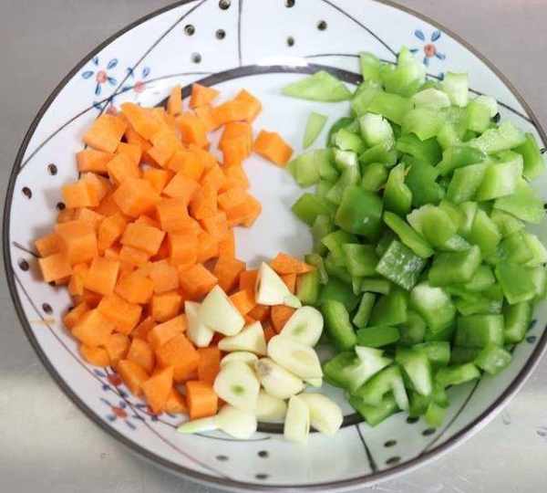 第16步、分別將青椒、胡蘿卜切丁,大蒜切塊熗鍋用。