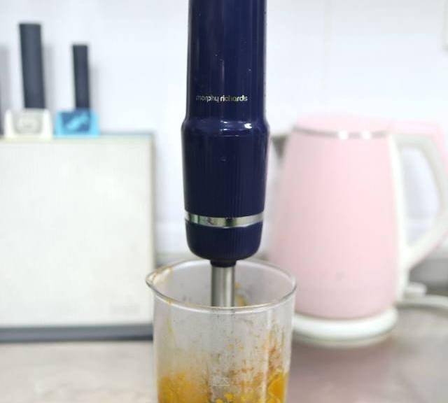 第3步、將蒸熟的南瓜丁放料理杯中,攪打成細膩的南瓜泥;沒有料理機用勺子碾成糊狀也是沒問題的。