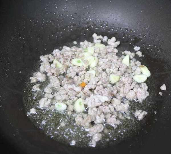 第17步、炒鍋中倒少許油,先將肉餡和大蒜瓣入鍋,煸炒變色出香味。