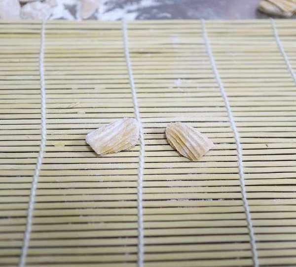 第13步、如果有壽司簾,就將面丁放在簾上,用拇指一搓,就成瞭帶印痕的貓耳朵狀;想使面卷像貓耳朵一樣有尖尖,小面丁要對角搓;沒有壽司簾就直接在案板上搓,成光滑的貓耳朵。