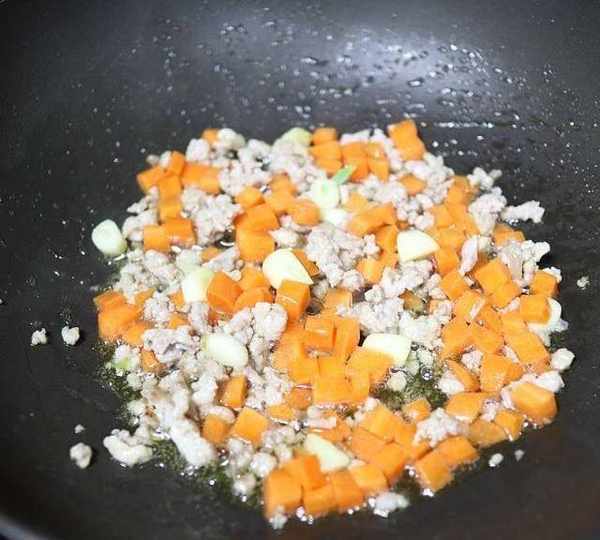 第18步、再將不易熟的胡蘿卜丁入鍋中翻炒變軟。