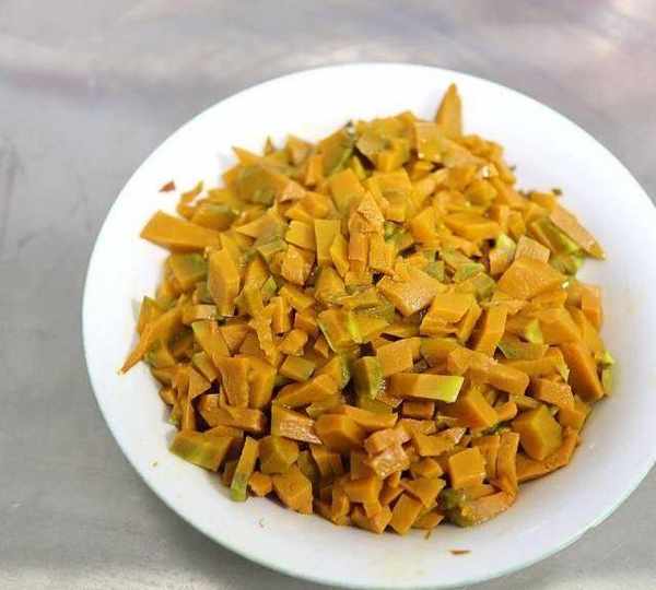 第2步、南瓜去皮去籽去瓤,先切薄片,再切細條、細丁,可加熱迅速,成熟快;蒸10分鐘左右就能全部熟透瞭。