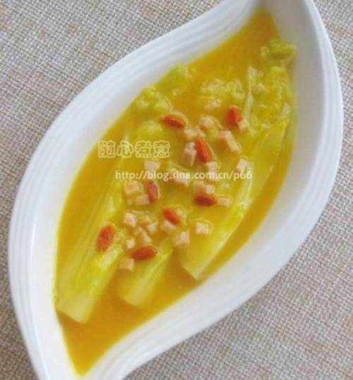 材料:娃娃菜2棵、高湯400ml、南瓜100g、枸杞子5g、火腿10g、淀粉10g、鹽2g