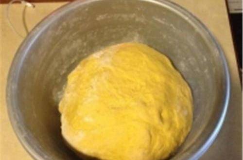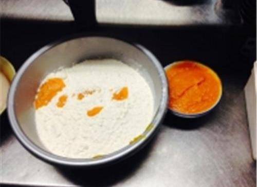 步驟用溫水化好的發酵水和面,把三分之一的南瓜泥混合攪入面粉中,揉成面團。