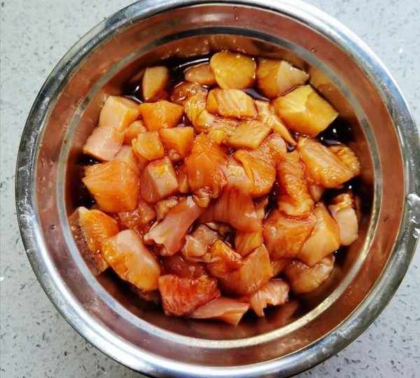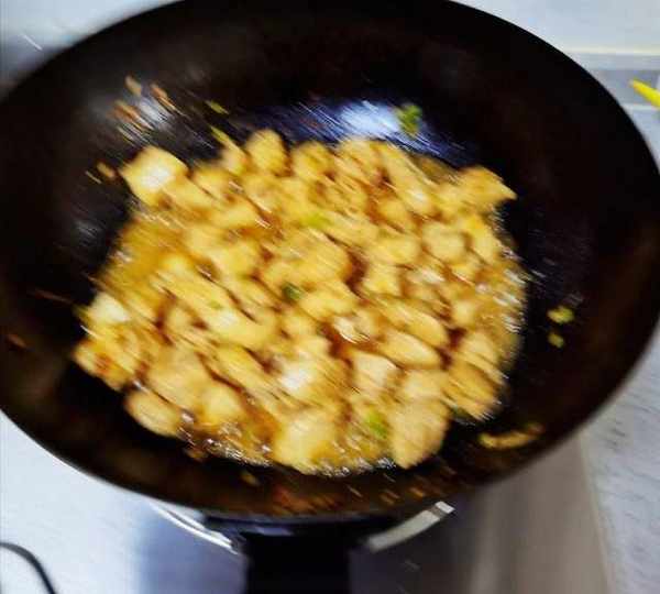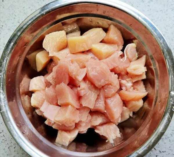 第8步、把醃制好的雞肉倒進去大火炒到雞肉變成白色。