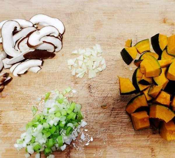 第6步、把兩個香菇洗幹凈切成薄片,大蔥切蔥花,南瓜切塊,大蒜切末。