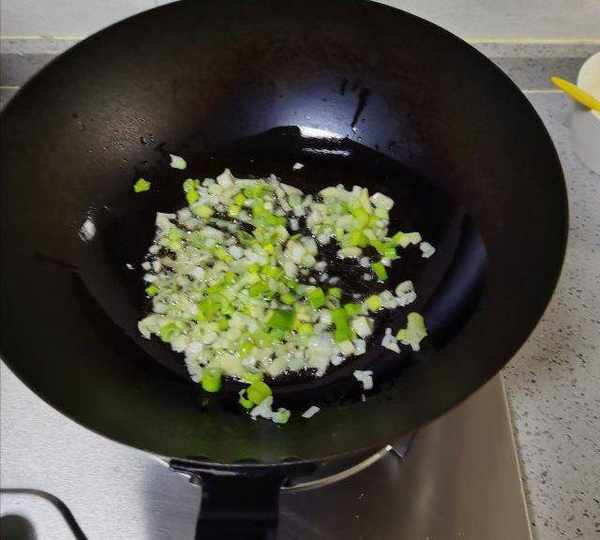第7步、鍋中倒油,油溫五成熱倒入蔥蒜末小火炒出香味。