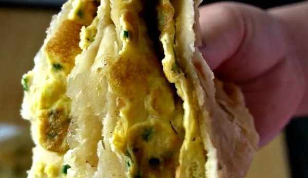 4:烙餅的時候,看到一面鼓起小泡翻一面,抹上一層雞蛋液,然後再翻面,等到雞蛋液定型,兩面是金黃色就可以出鍋瞭。